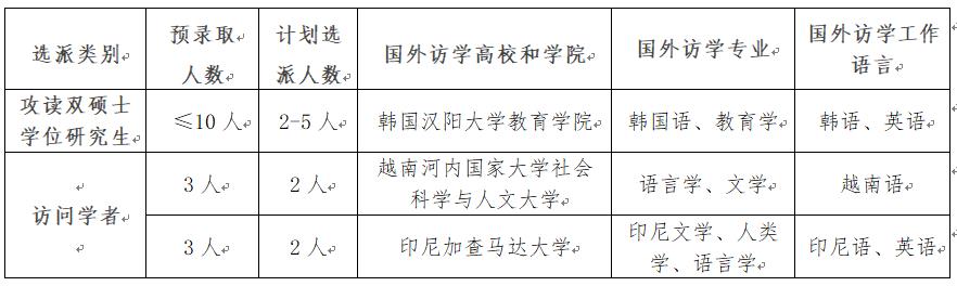 优先面向我校参与“RCEP校园”项目人才培养的学院的在编在岗教师(年龄不超过50周岁,1971年1月1日以后出生)进行选拔,本科毕业后应有5年以上工作经历,硕士毕业后应有2年以上工作经历。对博士毕业的申请人无工作年限要求。预录取计划不多于6人,从中选拔4人派出。派出人员可以申请享受国外访学期间国家留基委一次往返国际旅费和资助期限内的奖学金,国外访学时间不少于3个月。
