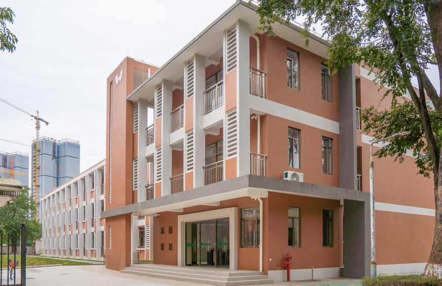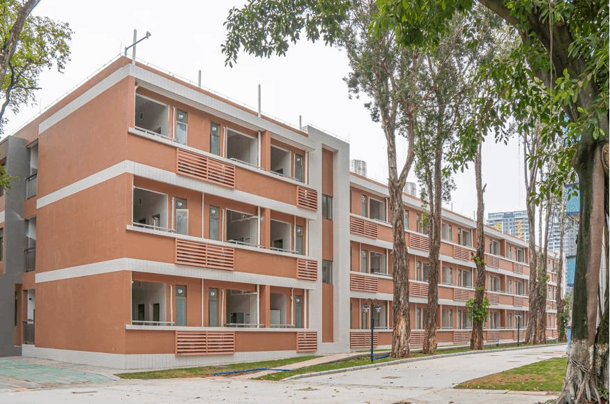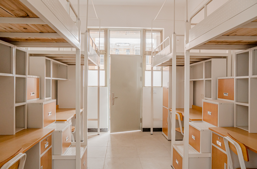 全新宿舍楼继续沿用了学校的红白主色调,为方便学生出行,在周边的草坪新建了石板路,在进楼的阶梯处设置了无障碍通道;为使得宿舍空间更加舒适,宿舍内楼层高度高达三米;宿舍为标准的四人间,设有简洁美观的独立卫浴和洗手台;新设挂钩和纸巾盒等贴心装置利于学生拎包入住,采用光滑墙壁和透明玻璃设计,让宿舍保持光线充足明亮。楼道里的消防栓采用隐藏式设计,楼道地板采用防滑材质,设计楼层屋檐外伸防止雨水飘进,采用加高的栏杆保障学生的安全;第二第三层还设有文化室和活动室丰富学生的宿舍生活。