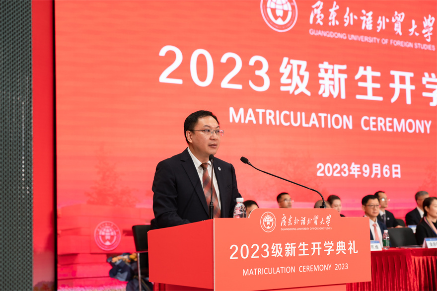 时维九月,秋动羊城。9月6日上午,学校在白云山校区体育馆设主会场,大学城校区、知识城校区设分会场,同步举行2023级新生开学典礼,欢迎7856名新生加入广外大家庭。校党委书记、校长石佑启发表以“与时代共进 向理想前行”为主题的致辞,副校长刘海春主持开学典礼。校党委副书记李云明,副校长何传添、焦方太,各学院主要负责人,全体2023级新生参加开学典礼。开学典礼在央广网和大学视频号同步直播。