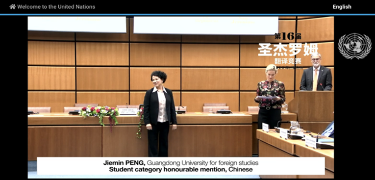 近日,第16届联合国圣杰罗姆翻译竞赛颁奖典礼在联合国维也纳办事处(UNOV)举行,揭晓获奖名单,我校高翻学院硕士研究生彭杰敏获英译汉学生组别荣誉奖(二等奖)。