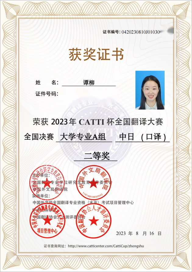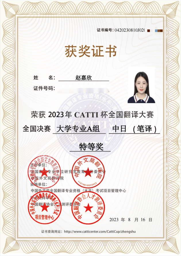 近日,2023年“CATTI杯”全国翻译大赛决赛举行,我校日语语言文化学院学子在全国决赛中获得优异成绩。其中,2022级日语语言文学硕士研究生赵嘉欣获得全国决赛大学专业 A 组中日(笔译)特等奖,2022级日语翻译硕士研究生谭柳获得全国决赛大学专业A组中日(口译)二等奖。