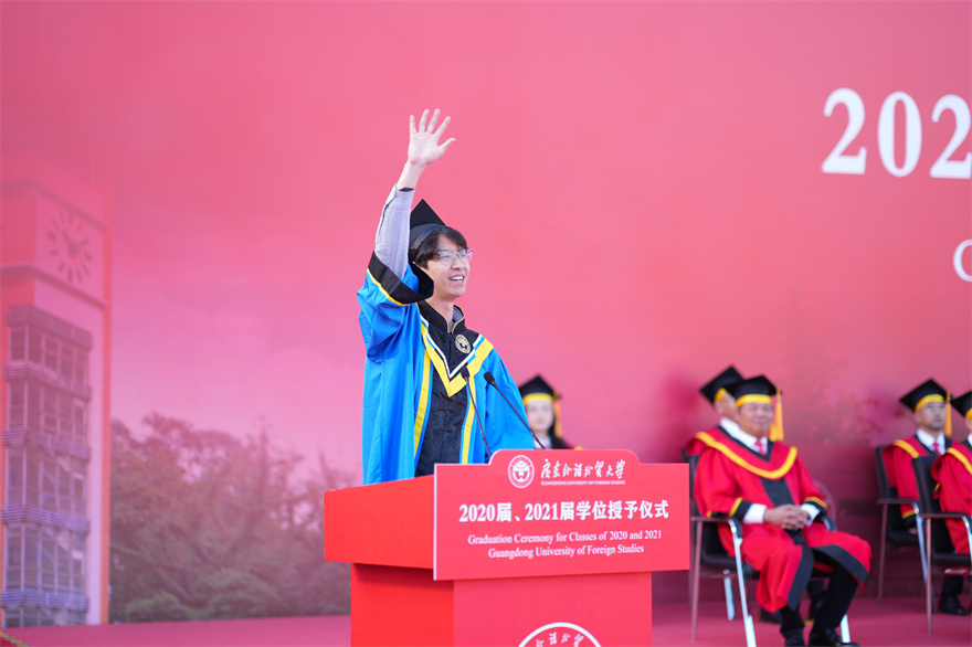 校友代表、新闻学院2020届毕业生王明哲在发言中感谢母校用一场盛大的告别仪式,为同学们人生中极具纪念意义的大学生活画上一个圆满的句号。他表示,在广外的求学时光有遇见、有尝试、有突破、更有收获,今后将始终秉持“卓越、诚信、包容、自信”的广外价值观,不断成长为更好的自己。