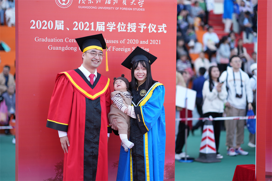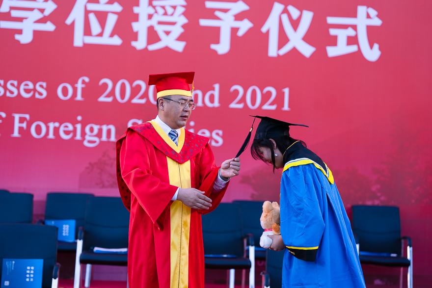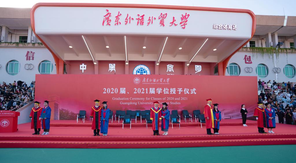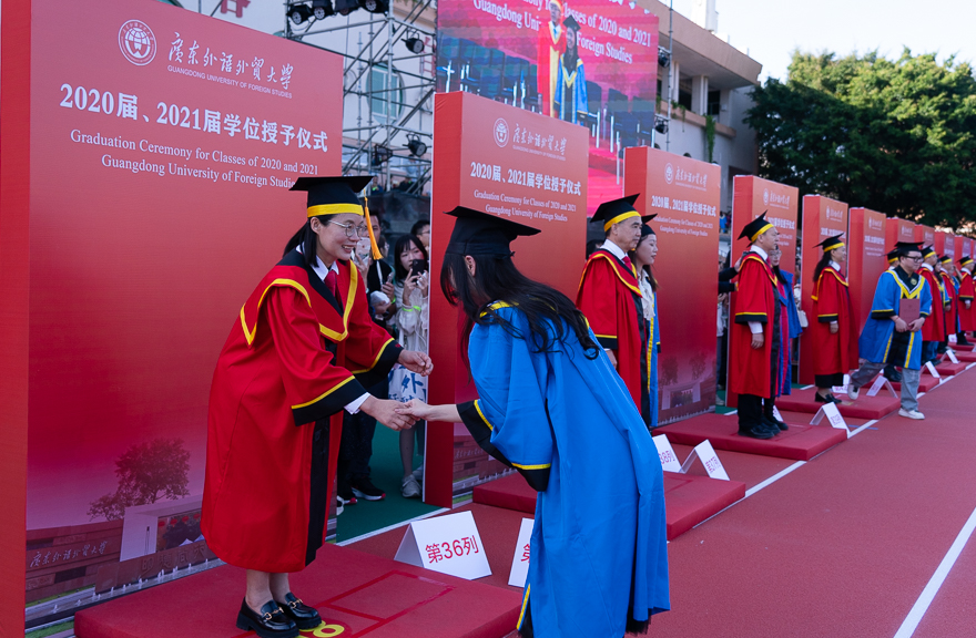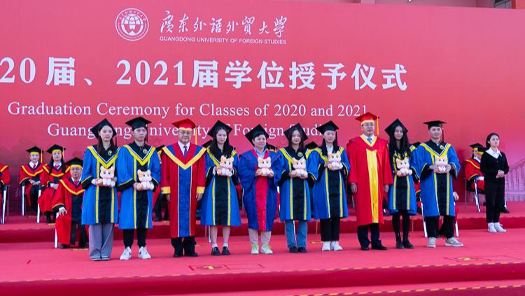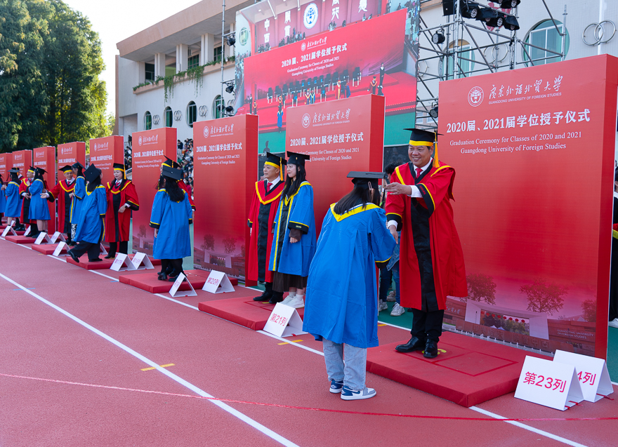 在全体毕业生宣誓后,校领导、主礼教授为每一位返校的2020届、2021届校友拨穗授礼,合影留念,为同学们在广外的青春岁月画上圆满的句号。