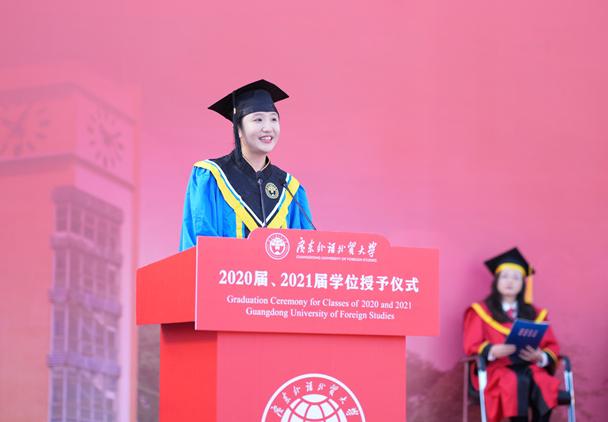 校友代表、英文学院2021届毕业生张冉细数在广外的奋斗与成长时光,向母校、父母、师长、挚友表达感恩之情。她表示,广外是我们一生中永远的家,不仅要常回家看看,也要常和旅人讲讲我们的家,期待下次再相聚。