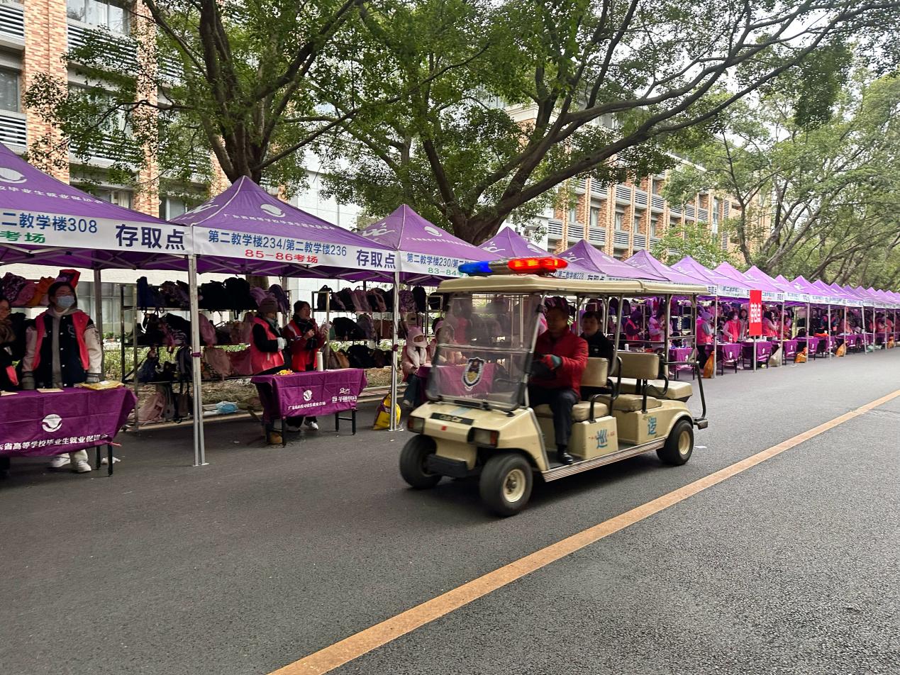 工作人员电瓶车载送即将迟到考生