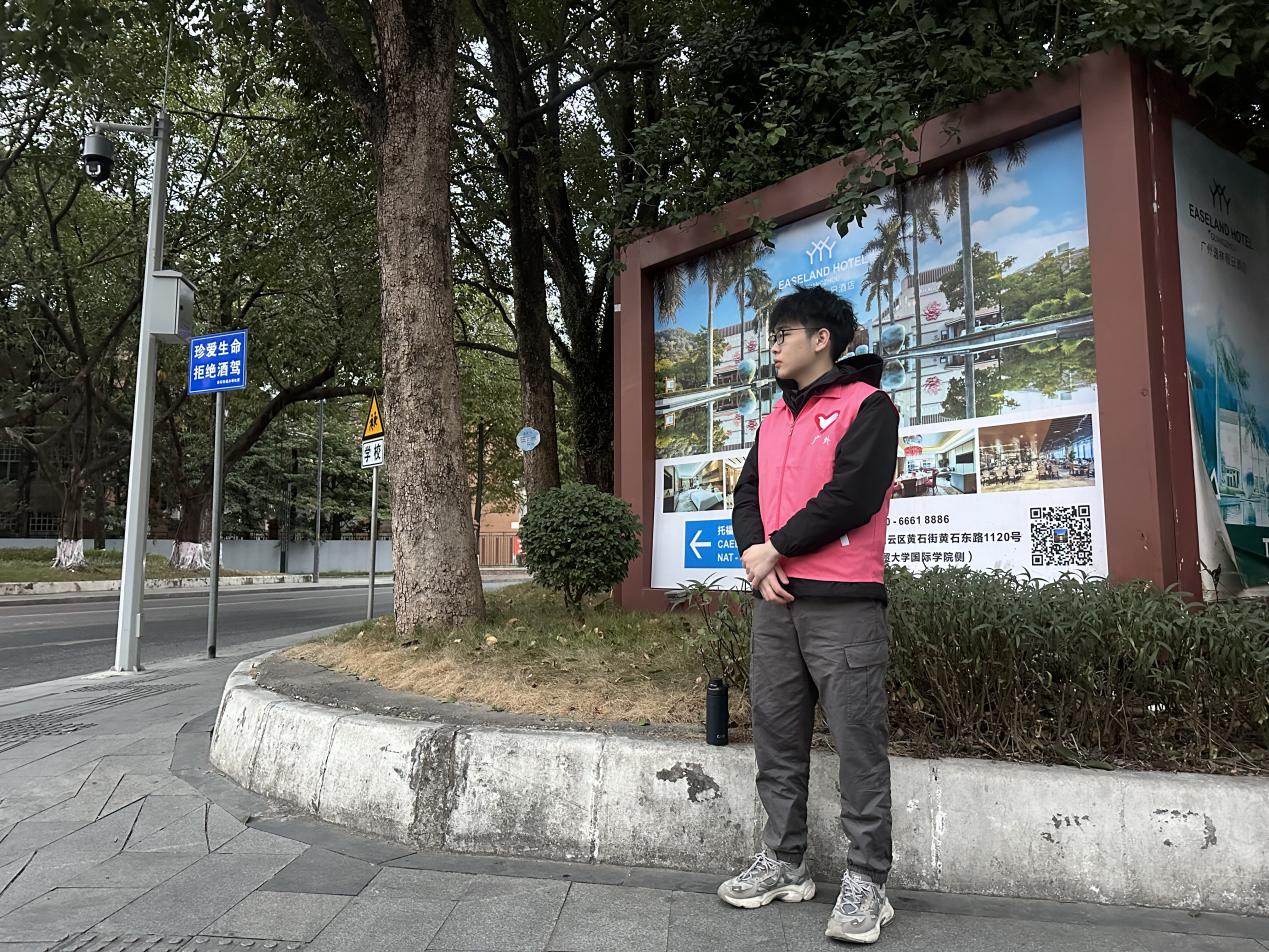 学生志愿者驻守入场路口提供交通指引