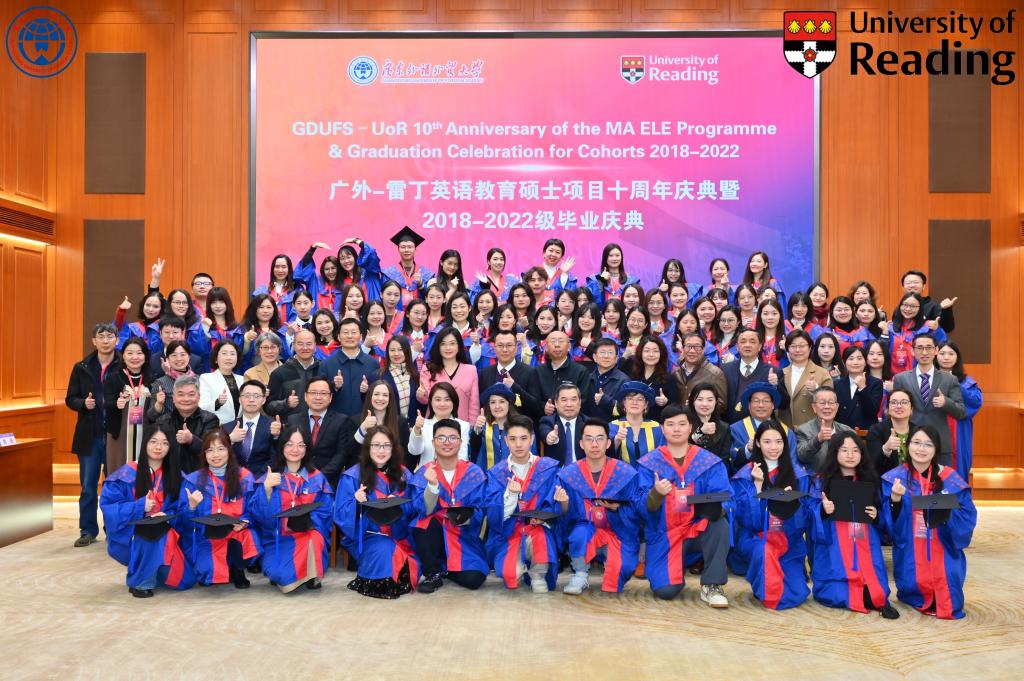 值此本次十周年庆典之际,英文学院还同时隆重举办了2018-2022级广外-雷丁项目毕业庆典活动。活动邀请雷丁大学李大国和我校英文学院教师王蕴峰作为教师代表发言;邀请校友代表孙逸、毕业生代表朱国花和在读学生代表赖彩霞分别发表感言。活动由英文学院副院长李成团主持。
