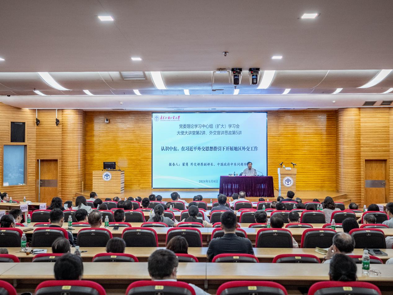 5月8日,我校党委理论学习中心组(扩大)学习会暨大使大讲堂第2讲、外交官讲思政第5讲在白云山校区图书馆报告厅举行,深入学习习近平外交思想和习近平总书记关于总体国家安全观的重要论述。外交部原副部长、中国政府中东问题特使翟隽作专题辅导报告。我校党委书记石佑启主持学习会。广东省委外办原主任、我校非洲研究院创院院长傅朗,校领导,校党委理论学习中心组成员,学校副处职(级)以上干部,亚非语言文化学院、国际关系学院等有关单位党员师生代表参加学习会。