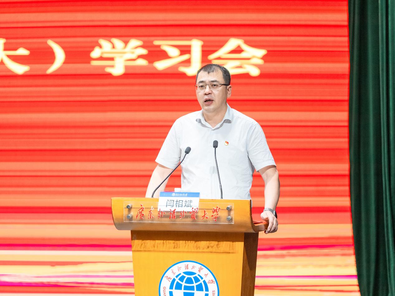 5月23日,我校党纪学习教育读书班暨党委理论学习中心组(扩大)学习会在白云山校区六教报告厅召开。在开班仪式上,校党委书记石佑启讲授纪律党课,校长闫相斌主持会议,校党委常委、纪委书记温燕欢作党纪学习教育专题辅导报告。校党委理论学习中心组成员、校党委委员、纪委委员、副处职级以上干部,党政机关、教辅单位科长(主任),教学、科研单位办公室主任,后勤实体主要负责人,广州市实验外语学校、白云外国语中小学主要负责人参加学习会。