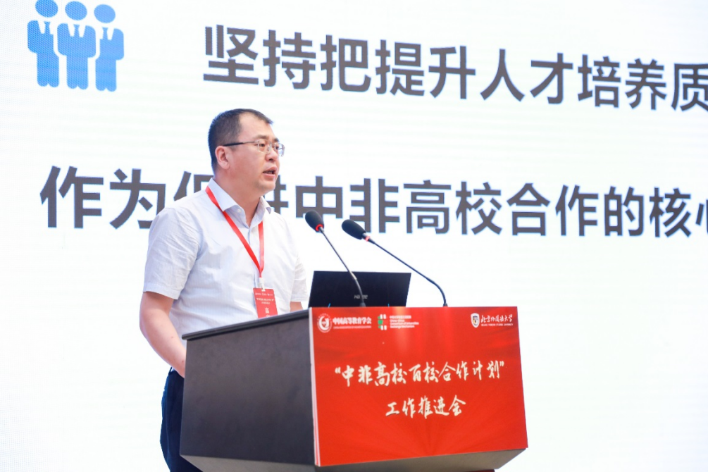 在高校代表发言环节,闫相斌作题为“加快构建高教开放新格局, 助力中非文明互鉴走深走实”的报告,从人才培养模式、教研科研成果、产学研一体化机制和国际中文教育四个方面总结了我校对非合作的主要模式和成果,展望了我校与非洲国家在教育领域的合作前景。