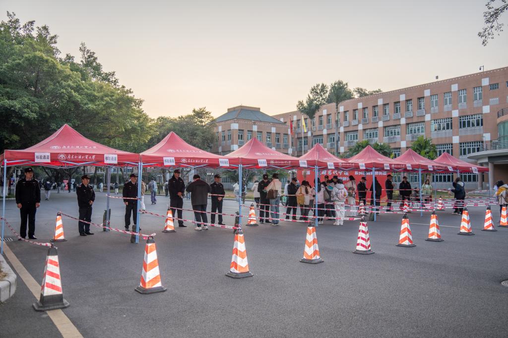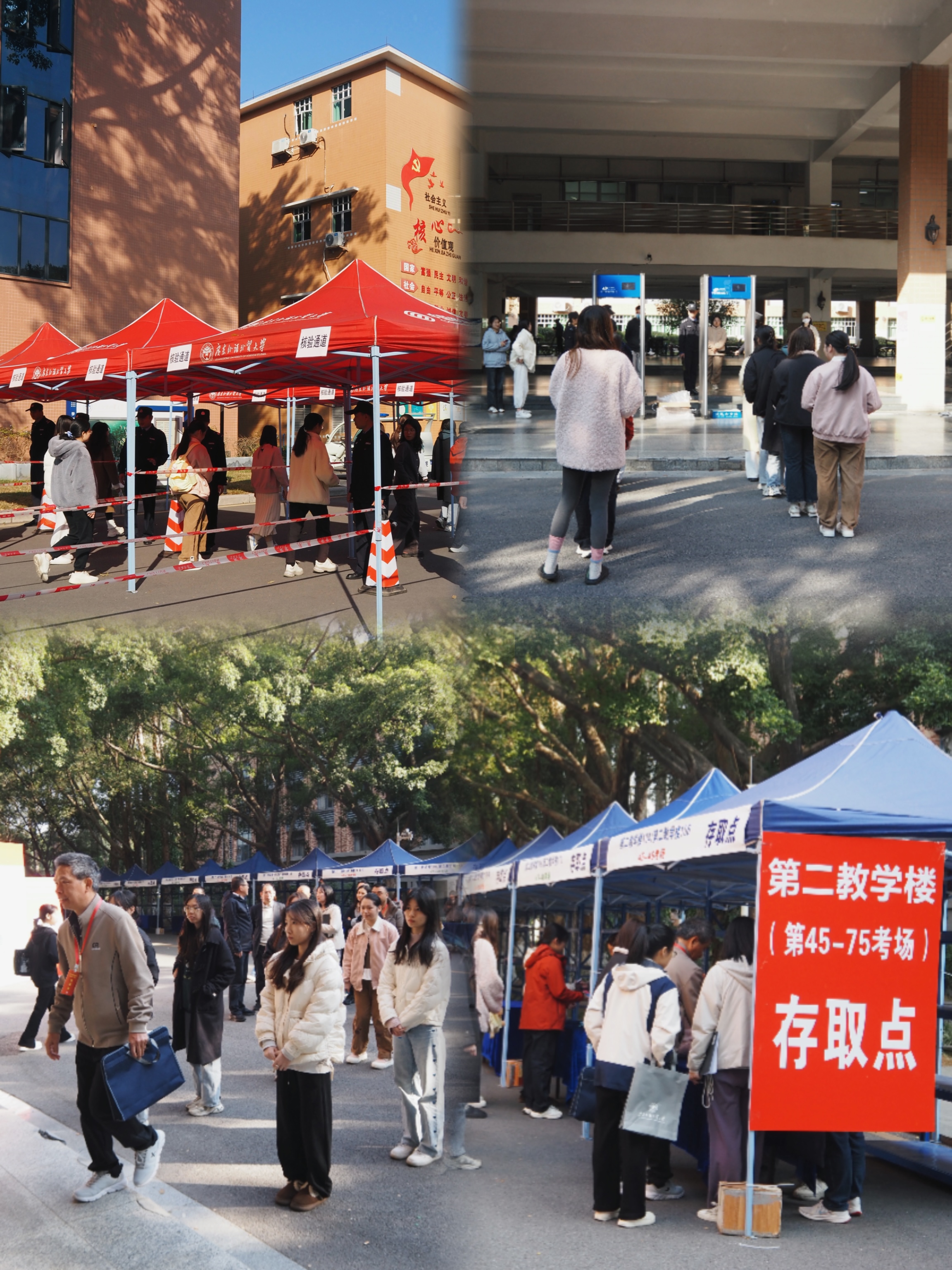 学校精心组织了一支近150名的学生志愿者团队,他们为考生们时刻提供无微不至的帮助与支持,为考生存取物品、指引路线、答疑解惑。工作人员展现出极高的专业性和责任心,用电瓶车载送即将迟到考生赴考、广播寻找丢失证件的考生,让他们能够安心地参加考试。