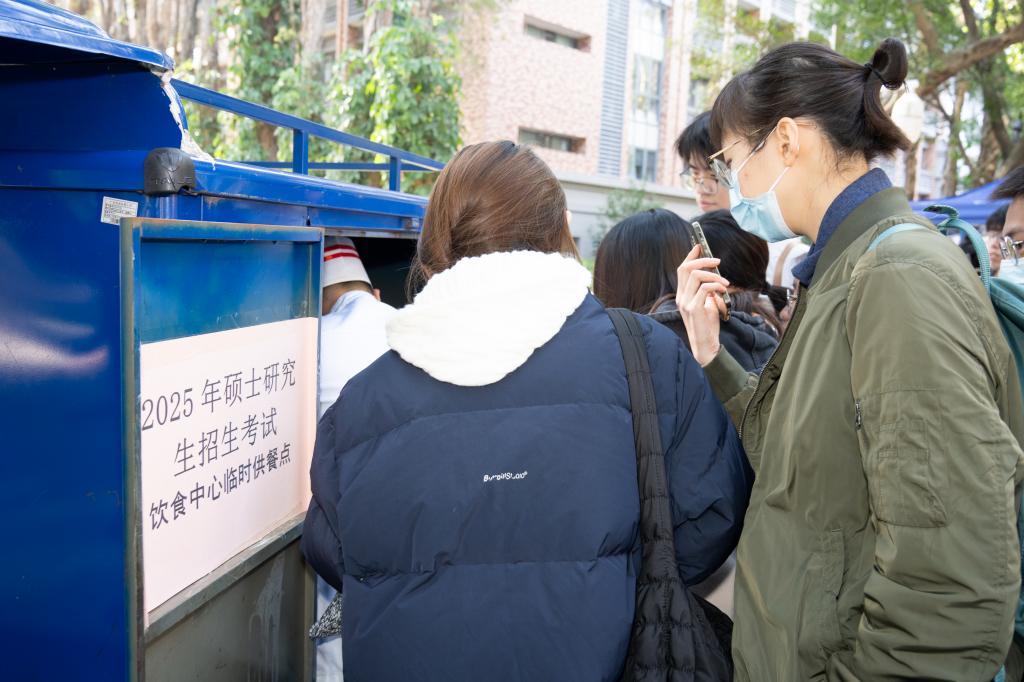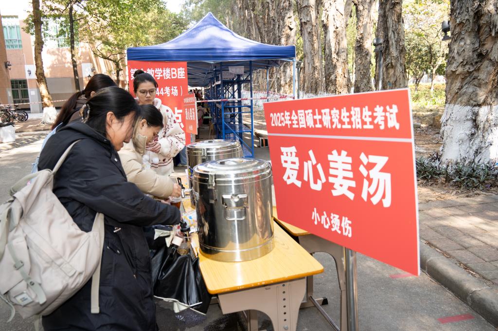 学校专门提前发布了研考温馨提示,内容涵盖考前准备、考场安排及考场规则、赴考指引等多个方面,方便考生熟悉考场环境,提前做好科学的赴考规划。为让考生能量满满,学校除了开放学生食堂供考生用餐和休息,还贴心设置了移动餐车,为考生提供便捷的用餐服务,更有温情满满的红糖姜汤,为考生带去丝丝暖意。考场还设置了医疗服务点,考生可按需取用口罩、消毒洗手剂、药品等医疗物资,让考生无后顾之忧。