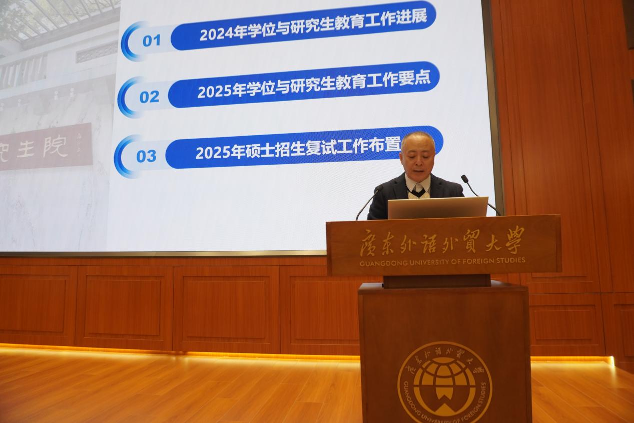 申明浩副校长指出,今年是贯彻全国教育大会精神、落实《教育强国建设规划纲要(2024—2035年)》的关键之年,是学校“高水平大学建设”和实现“十四五”规划目标的收官一年。习近平总书记在党的二十届三中全会上明确了统筹推进教育科技人才体制机制一体改革的重要任务,在去年全国教育大会上系统部署了全面推进教育强国建设的战略任务和重大举措,这些重要指示和精神为学校做好研究生教育工作指明了前进方向、提供了根本遵循。申明浩副校长提出要深化分类培养路径,以科教融汇、产教融合为方向,以数字化、智能化、国际化赋能为赛道,以课程、教材、论文、国际交流为抓手,加强研究生培养链条全过程管理,提升人才培养质量,重点做好六项工作:一是重点增强学位点内涵和人才培养质量,实现评估的上榜进位,扎实推进学位点核验工作,不断完善学位点动态调整机制;二是提升课程建设质量,加强学术学位和专业学位核心课程体系建设,充分发掘专业课程的思政教育功能,提升课程育人效果;三是提升培养和学位授予质量,按规定认真做好研究生培养关键环节的质量跟踪,做好研究生学业预警和分流选择,严格执行最长学习年限制度;四是提升高层次国际化人才培养质量,进一步在拓宽平台、提升层次、树立品牌上下功夫,在中外合作办学机构申报、留基委国际化品牌项目打造、粤港澳联合培养专项深化、“多语种+专业”创新培养上推出更多亮点成果;五是培育产出高水平育人成果,争取在研究生层面获得更多省级奖项,向国家级教学成果奖发起冲击,同时要做好引导和组织,激励教师编著适应时代要求、适用范围广泛、专业特色显著的高质量研究生教材;六是严格把关招生复试工作质量,各培养单位要严格规范复试组织工作,加强考前考中考后管理,确保研招的安全性、公平性和科学性,做到稳中求进,稳妥完成2025年硕士复试录取工作。