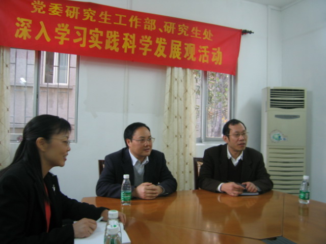 曾用强介绍了研究生部(处)的各办公室负责人及工作职责,并简要总结了研究生部(处)一年来的工作情况。他特别提到了研究生部(处)“三心(爱心、责任心、上进心)、三化(制度化、规范化、科学化)”的工作理念对部处工作的促进作用。并提出今后部处工作要在制度化、规范化的基础上,在质量、创新、特色上做出更大成绩。研究生工作部部长敖湘晖汇报了部处学习实践科学发展观分析检查阶段召开的“查找问题恳谈会”、“党支部专题组织生活会”、“领导班子民主生活会”的情况和取得的成效。