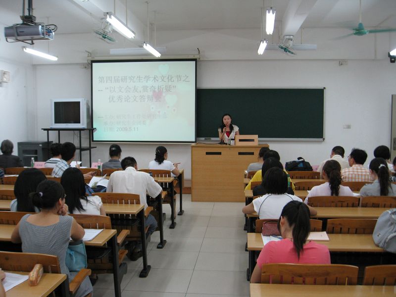 本网讯 5月11日晚,第四届研究生学术文化节之“以文会友.赏奇析疑”优秀论文模拟答辩在北校六教B214和南校G309同时举行,参与答辩的十位优秀论文作者代表不同学院、不同专业研究生,在台上一展雄辩风采。当晚,经贸、商英和管理等十个学院均派出一名老师为比赛担任评委。南北校区比赛分别由党委研究生工作部部长敖湘晖和研究生会指导老师苏高阳主持。
