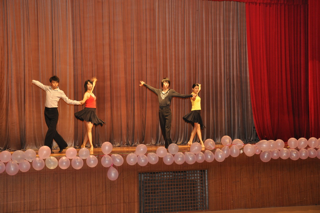 首先是以广外绿精灵舞协激情演绎的拉丁舞开场。他们热情奔放的舞蹈瞬间就将现场观众的眼球吸引住了。当现场观众还在对刚结束的拉丁舞意犹未尽时,主持人马上将大家带入了舞伴配对环节。在工作人员的协助下,男生女生分别围成一个圈,女生围外圈,男生围内圈,现场播放音乐,男女生随着音乐相向而走,当音乐停下时,相对应的男女生为一对。在组合成功后,舞蹈老师又对大家进行了一段简短的舞蹈教学。