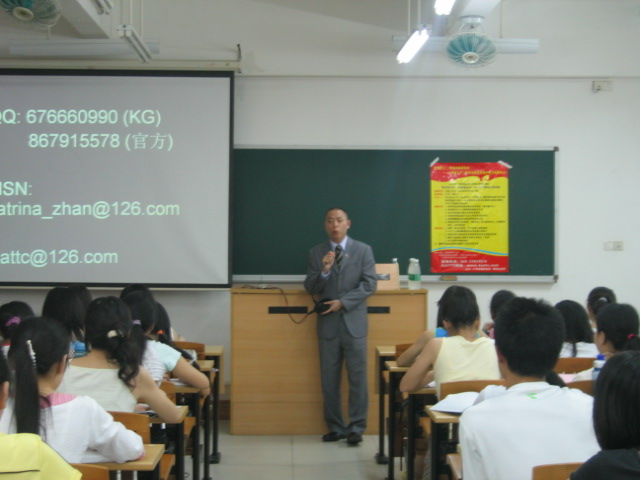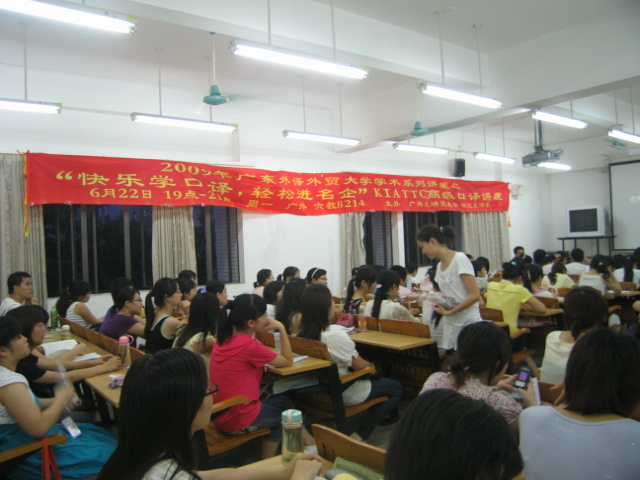 本网讯6月22日晚7点,我校北校区六教B214教室座无虚席,由研究生会、研究生团委主办的09年学术系列讲座之“快乐学口语,轻松进名企”KIATTC高级口译讲座在此举行。期间,著名口译专家KG老师为在座的广外学子带来了一场口译盛宴,让口译不再神秘。