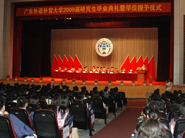 本网讯凤凰花开,骊歌声起。6月30日上午,2009届研究生毕业典礼暨学位授予仪式在北校区云山会堂隆重举行。来自文科基地、英文、经贸、商英、管理、西语、东语、中文、法学、政管、翻译、词典学等12个研究生培养单位的20名博士研究生、442名硕士研究生毕业生齐聚一堂。