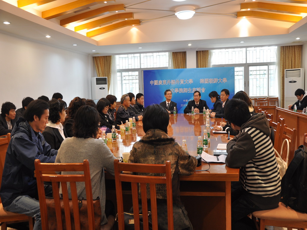 本网讯1月12日上午,韩国朝鲜大学研究生院院长朴顺哲率该校师生代表团来访我校。我校研究生处处长曾用强、东语学院副院长全永根、朝鲜语系主任金美等在北校区行政楼第二会议室亲切会见了来宾。双方为进一步的交流学习举行了座谈会,会议由全永根主持。