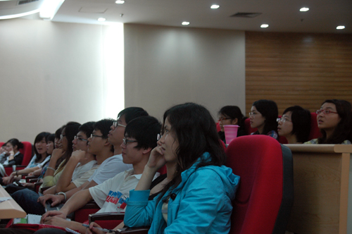讲座中,俄罗斯友人首先介绍了俄罗斯的地形地貌状况,他特别强调,“俄罗斯气候寒冷且变化多端,天气预报是靠不住的。”这使观众对这个横跨欧亚,东西跨度达9000公里的国家有了初步的了解。他还介绍了俄罗斯的国旗、国歌、总统、总理,并向观众展示了家乡圣彼得堡独特唯美的建筑和自然旖旎的分光,这座“最具欧洲风格城市”的景色着实让人赞叹不已。一位名为尼古拉的俄国朋友展示了俄罗斯的“七大奇迹”,风景图片美不胜收,给观众带来了一场完美的视觉盛宴。