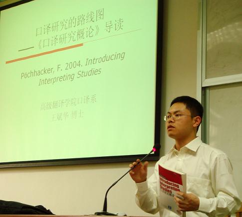 王斌华以西方著名口译研究者弗兰茨·波契哈克(Franz Pöchhacker)的《口译研究概论》(Introducing Interpreting Studies)为例,为在座研究生进行了详细的导读。他表示,这本专著堪称口译研究的必读书,许多著名翻译理论家都称之为“口译研究的权威路线图”。他将全书十章划分为三大部分:一至五章是“理论基础”,六至九章是“选题及研究”,十章是“研究趋向”。王斌华的细致分析使同学们较快抓住了书的重点和阅读技巧。