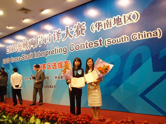 本网讯 4月30日,第二届“海峡两岸全国英语口译大赛”华南赛区决赛在暨南大学隆重举行,比赛云集了福建、广东和广西地区数十所高校选派的48名口译精英。我校翻译学院翻译学09级研究生洪淼和夏之梦代表学校参赛,经过三轮的激烈角逐,夏之梦以突出的表现摘得了一等奖桂冠,洪淼凭借良好的口译能力获得了二等奖。