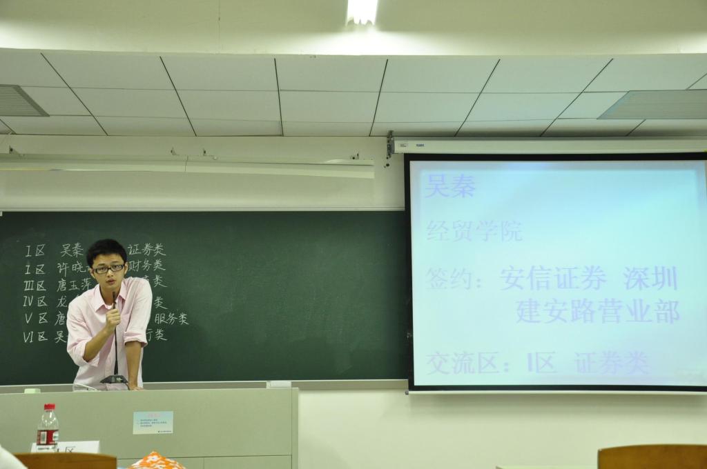 签约安信证券的经贸学院吴秦先从职业生涯发展的角度强调了现在所找的工作对以后的生涯发展的重要性,鼓励研究生选择自己感兴趣的行业。随后他从细节上介绍了简历制作和面试的经验技巧:一份精心制作的、高质量的简历会给面试官带来好的印象,面试过程中自信和灵活是制胜的关键。