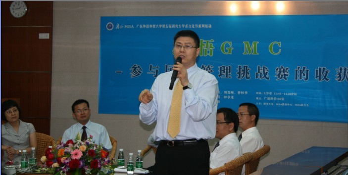 本网讯 5月9日下午,我校研究生学术文化节系列活动之主题为“感悟GMC——参与国际管理挑战赛的收获”的分享会在广晟讲堂举行。分享会由MBA联合会学习发展部部长09B班刘莹主持,特邀GMC挑战赛我校MBA领队老师马绍壮博士和09珠江队全体参赛队员作为嘉宾进行分享。MBA中心执行主任孙建军,办公室主任徐艺青,联合会主席王进宏,副主席扶艳芬参加了本次分享交流会。