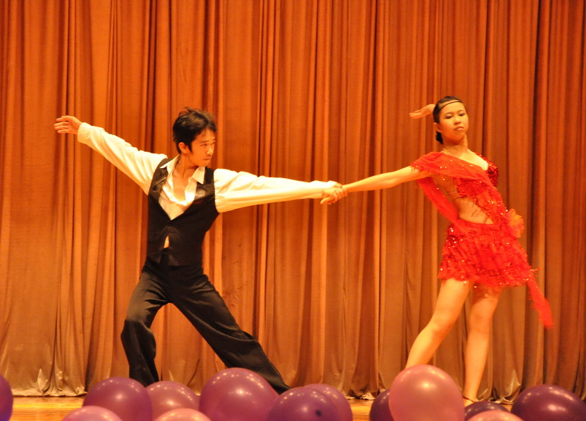 欣赏着精彩的节目,台下的观众早已按捺不住激动的心情,跃跃欲试。于是,在主持人的引导下,研究生们分成了男、女两组,男生围在里圈,女生围在外圈,随着音乐相向而行,在音乐停止的瞬间,里外相对的男女生即成为舞伴。现场舞蹈教学以表演者示范,舞蹈老师教学,配乐自由练习的形式进行。观众可在舞蹈老师教学和配乐自由练习阶段与舞伴一起学习,练习三步、四步、恰恰等舞蹈。