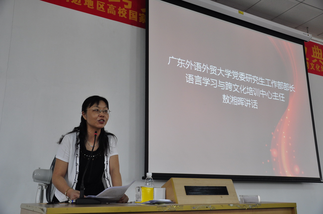 结业典礼伊始,敖湘晖首先讲话,她带来了我校党委副书记、基地办公室主任许国彬对对广大学员一学期学有所成表示祝贺和对培训中心的全体工作人员表示慰问与关怀。她同时指出,有继续学习语言愿望的同学可以继续参加中心开设的提高班,希望广大学员能与身边同学宣传,共同分享这一资源,并表示下期教员招聘将更为严格,更为强调端正的教书育人态度。最后,敖湘晖提出三点希望,一是学员要积极利用好培训中心的资源,积极在大学时期充实自我,同时希望学员能及时反馈意见,为培训中心的发展献计献策;二是教员需多总结经验,并继续为培训中心效力;三是培训中心工作人员应继续付出,完善培训中心的建设。