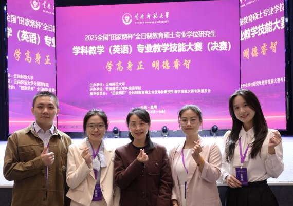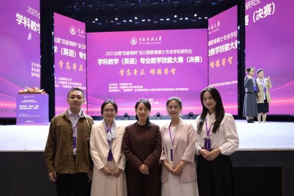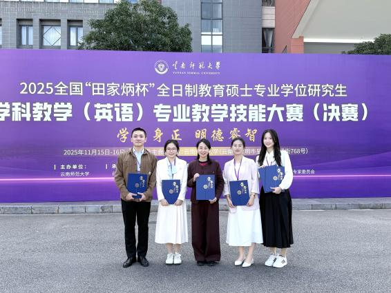 2025年全国“田家炳杯”全日制教育硕士学科教学(英语)专业技能大赛决赛于11月14日至16日在云南师范大学圆满落幕。本次大赛吸引了全国100所院校的264名研究生同台竞技,全方位考核了选手的专业知识储备、实践教学能力与综合素养。经过评审委员会的严格遴选与专业考评,来自我校英语教育学院学科教学(英语)专业的曾泳泽、郑婉怡、张茜婷和杨靖怡四位同学在李惠胤副院长的细心指导下斩获佳绩。其中,曾泳泽同学斩获全国一等奖,郑婉怡、张茜婷两位同学荣获全国二等奖,杨靖怡同学荣获全国三等奖。