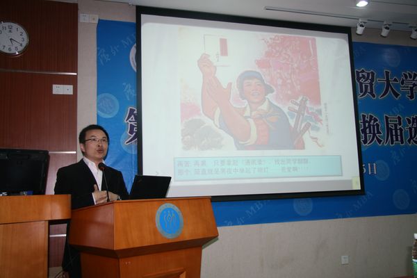在填写选票和统计选票期间,王进宏对任期的工作做了总结报告。在报告中,他回顾了过去一年里联合会的主要工作内容及筹办过的大型活动,他肯定了同学们对联合会工作做出的努力与贡献,并感谢MBA教育中心对联合会工作提供的支持。最后,他指出,联合会的工作仍存在不足,希望下一届联合会能够正视不足、积极改进,并祝新一任主席团工作顺利。