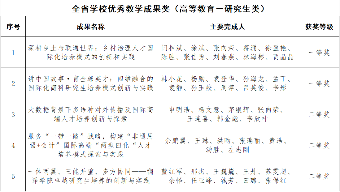 本次获奖的5项成果集中体现了近年来我校立足学科特色、深化研究生教育教学改革、强化高质量创新培养的探索与实践,彰显了学校在研究生教育建设方面的突出成效。