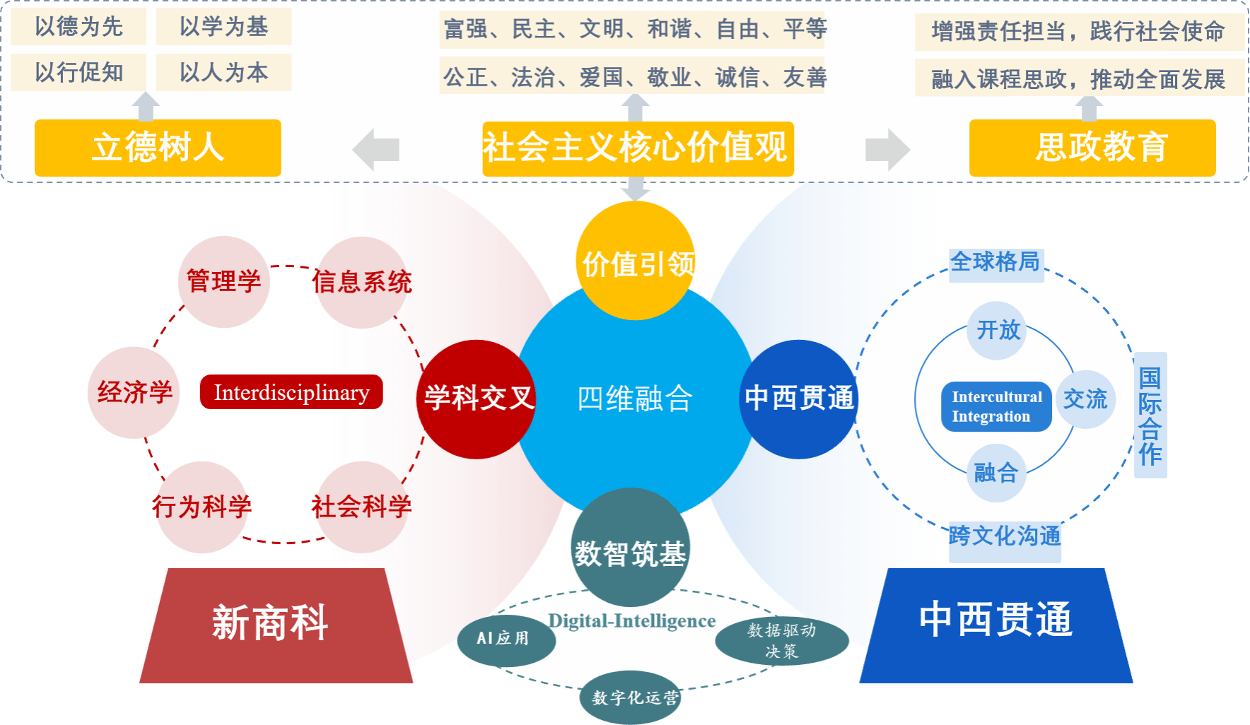 本成果立足于新时代对高层次商科人才的战略需求,以 “讲中国故事,育全球英才”为根本宗旨,秉持 “价值引领国际化、学科交叉数智化” 的核心使命,创新构建了 “价值引领-中西贯通-学科交叉-数智筑基” 四维融合的人才培养模式。在“讲中国故事”方面,成果将中国发展实践、治理智慧与商业伦理深度融入课程体系与案例教学,引导学生扎根中国大地理解商业规律,树立文化自信与价值担当,成为能够向世界阐释中国道路、中国方案的卓越使者。在“育全球英才”方面,通过深度融合中西商学精髓、搭建跨学科知识体系、强化数智技术赋能,培养学生解决全球性复杂商业问题的创新能力与国际竞争力。