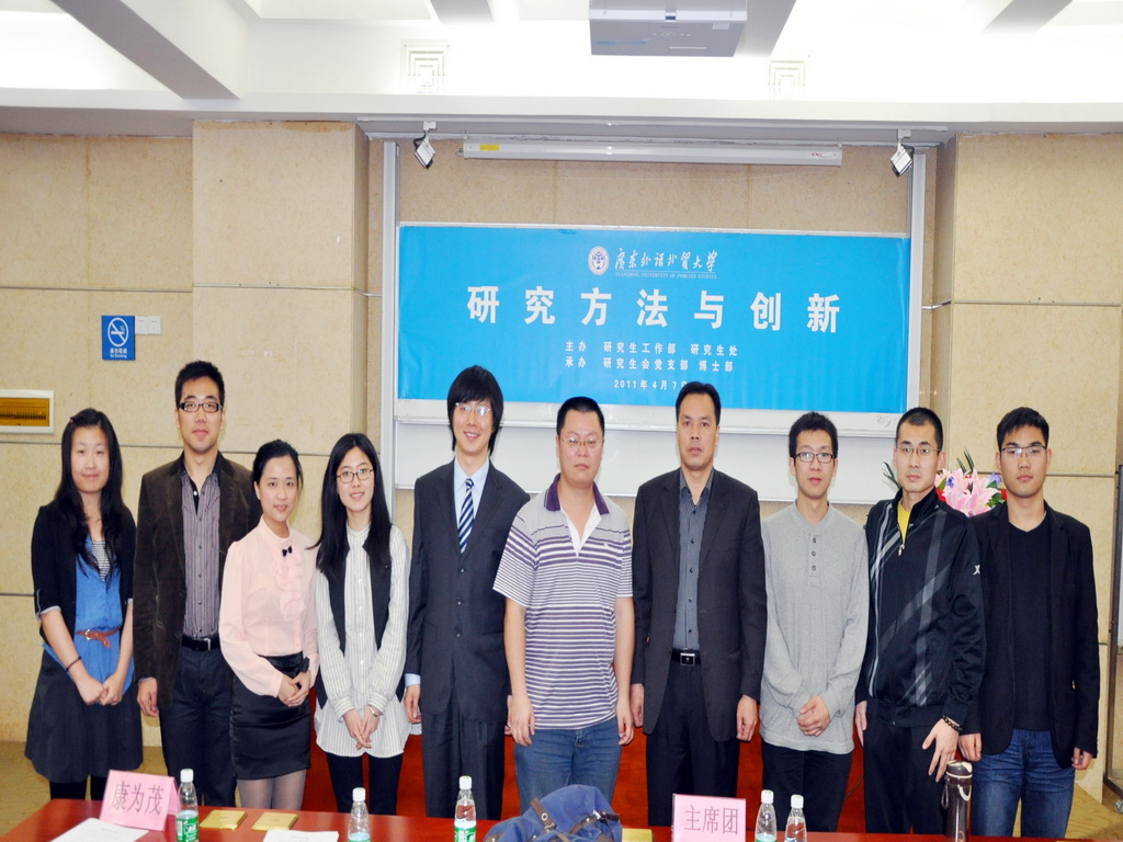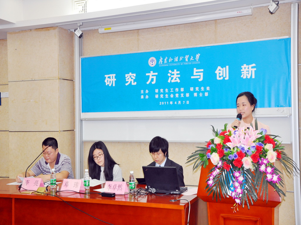 本网讯 4月7日晚,研究生学术文化节之博士生论坛“研究方法与创新”在北六教B103黄华讲堂顺利举行,本次论坛邀请了三位拥有丰富学习经验的博士生作为主讲嘉宾,他们分别是文科基地李亮、西语学院邓玮和外国文学文化研究中心李卓然。