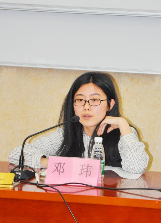 邓玮四川乐山人,师从蔡小红教授,研究方向为口译理论与实践。坚持“学我所爱”,自硕士阶段起如愿以偿跟随蔡小红教授学习口译技能、从事口译研究。曾于2009年和2010年分别参加“全球化视域下翻译教学与研究”研讨会及第八届全国口译大会暨国际研讨会并宣读论文。口译实践亦不偏废:2009年获第二届全国高校口译邀请赛法语交传组三等奖;长期为广州法语联盟、法国驻广州总领馆文化处提供交替传译及中法双语主持服务;也为联合国创意城市网络深圳国际大会工作会议、“社会学之权利的新关系与当前的统治形式”国际研讨会等提供同声传译服务。