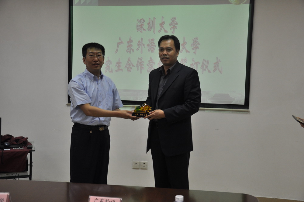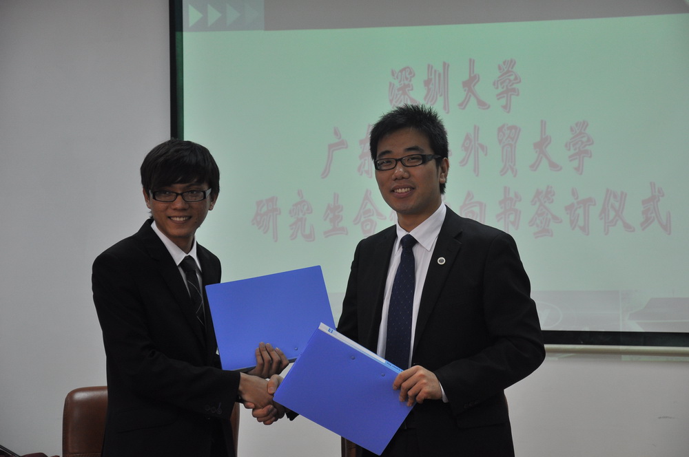 会议结束后,广外研究生会主席王冠尧和深大研究生会主席黎雨苗代表两校签署了合作意向书。双方领导愉快地互赠了纪念品并合影留念。