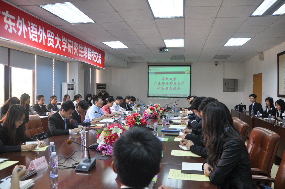 本网讯 4月22日,应深圳大学研究生院(筹)邀请,我校研究生工作部、研究生会代表前往深圳大学进行交流活动,受到深圳大学研究生院(筹)的热烈欢迎。广东外语外贸大学研究生工作部部长康为茂,研究生会指导老师苏高阳,研究生会、语言学习与跨文化培训中心学生干部20余名一同前往参与了交流会。