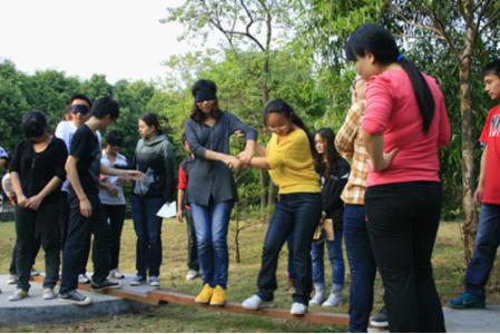 游戏环节中,各小组在培训师的带领下分别进行了“电网”、“鼓动人心”、和“孤岛求生”等拓展活动。在“电网”游戏过程中,被搬运的同学需要把自己完全托付给搬运的同学,而负责搬运的男生则必须注意保护同学们落地时的安全。该游戏增进了队员间的信任感和责任感。在“鼓动人心”游戏过程中,各组队员配合默契,摸索规律,并及时总结经验,逐渐掌握窍门并取得了很好的成绩。
