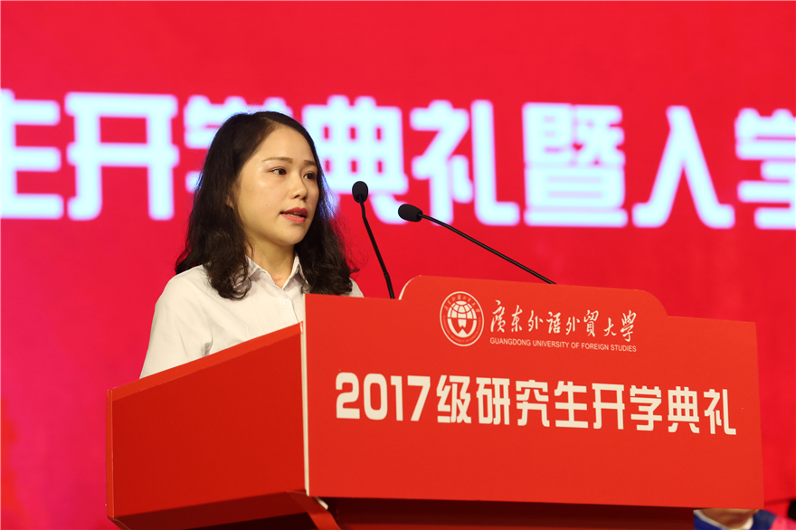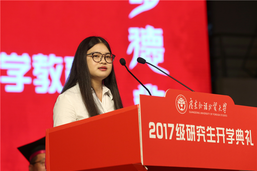 老生代表、商学院研究生徐留琴在发言中说,希望做“有态度、有追求、有能力、有真心”的“四有”广外研究生。新生代表、文科基地陈超和经贸学院刘映曼分别作为博士生和硕士生代表发言,他们表示,将珍惜在广外的日子,潜心学问,志存高远,“撸起袖子加油干”。