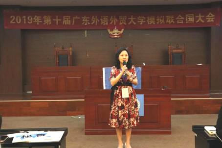 模拟联合国协会指导老师国际关系学院孙章季老师,首先肯定了代表对模联的积极参与。对各位代表的风采与表现,她表示由衷的赞赏。同时强调:“模拟联合国,最需要的是更加贴切真实的国际政治现实,希望大国的代表能够更加积极地在会场上发言动议。模拟国家代表,要具有‘国家干部’的气质,要站在代表国的角度,尽所能为代表国争取利益。” 最后,孙老师向各位参赛者介绍了2019年“广东省联合国与模拟联合国研究生暑期培训班”,动员“各国代表”与研究生踊跃报名参加,切身领略模联舞台的大家风范,抓住向优秀模联人学习的机会。