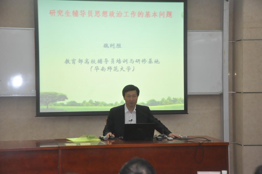 ,我校研究生辅导员工作培训会在北校区第六教学楼B103室举行。教育部高校辅导员培训与研修基地常务副主任魏则胜作题为《研究生辅导员思想政治工作的基本问题》的专题报告。