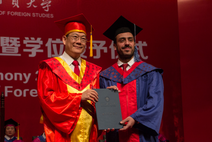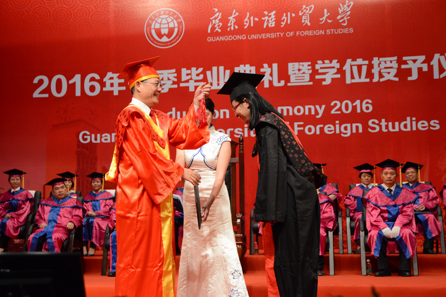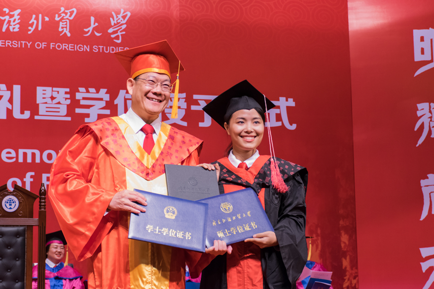 本次典礼上有一位特殊的毕业生——来自高级翻译学院的博士生许艺,她已经是第三次在云山会堂参加毕业典礼了,手捧着博士、硕士、学士证书和校长合影的她引来了全场阵阵惊呼。在我校坚守多年一心向学的她,为学弟学妹们留下了这样的感悟:“保持一颗纯洁的心,崇尚科学崇尚智慧,去感受人生的美好”。