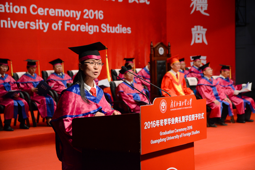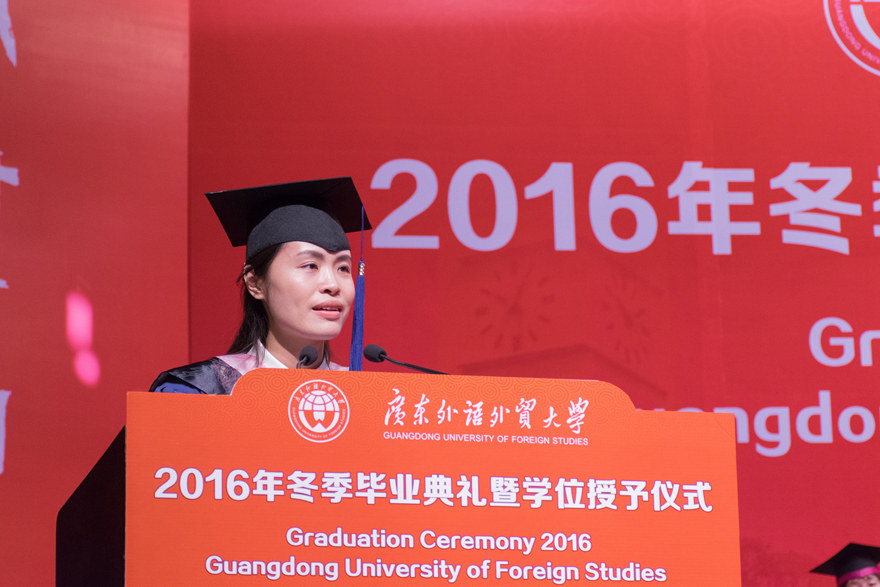 商学院硕士研究生何绮翎作为学生代表发言。她感慨道,在广外的三年,不仅收获知识,更有师生情谊和同窗友情。在发言中,她感谢亦师亦友,循循善诱,赐予知识的力量的老师;失意时互相勉励,困难时彼此扶持,共同经历笑与泪的同窗;默默支持、不求回报的家人和在事业和学业中努力平衡,坚持梦想的自己。“一段广外路,一生广外情”,她鼓励同学们始终铭记“明德尚行,学贯中西”的校训,做一名有德有才有情有义的广外人。
