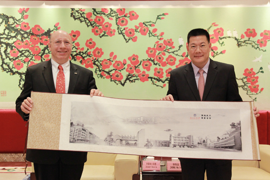 仲伟合首先对代表团的来访表示欢迎,并向乔·贝西介绍了我校的建校历史、在校学生情况以及我校各专业特色。他提到,我校倡导所有学生学好英语。许多学生选择英语作为自己的专业来学习,在高要求的英语教育下,不断提高自己的英语能力。因此我校学生在留学过程中能够较快克服语言交流的难关。目前我校也通过组织各种项目,为学生提供更多的留学机会。