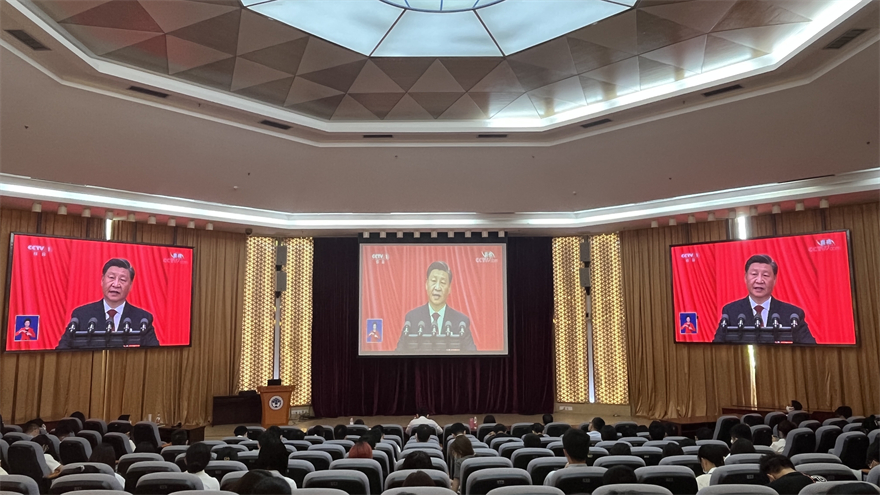 在场收看直播的师生聚精会神,认真学习领会大会精神。开幕会直播结束后,师生们欢欣鼓舞,倍感振奋,反响热烈。大家一致表示,党的二十大是在全党全国各族人民迈上全面建设社会主义现代化国家新征程、向第二个百年奋斗目标进军的关键时刻召开的一次十分重要的大会。习近平总书记作的报告,全面总结了过去五年的工作和新时代十年的伟大变革,科学谋划未来五年乃至更长时期党和国家事业发展的目标任务和大政方针,提出一系列新思路、新战略、新举措,是指导我们全面建设社会主义现代化国家、向第二个百年奋斗目标进军的纲领性文献。党员干部表示,将不忘立德树人初心,牢记为党育人、为国育才使命,认真履职尽责,以实际行动学习好、宣传好、贯彻好党的二十大精神。青年学生表示,将坚定不移听党话、跟党走,让青春在全面建设社会主义现代化国家的火热实践中绽放绚丽之花。