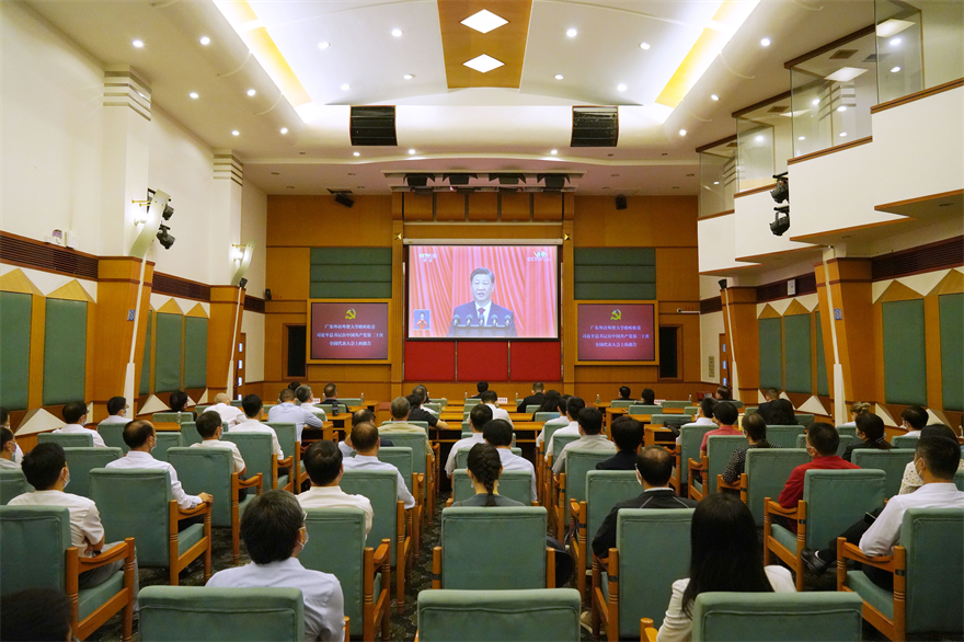 本网讯 10月16日上午10时,中国共产党第二十次全国代表大会在北京人民大会堂开幕。中共中央总书记习近平代表第十九届中央委员会向大会作报告。我校分别在白云山校区国际会议厅、六教报告厅,大学城校区八角楼会议室,知识城校区进德楼305学术报告厅设置四个直播现场,组织近600名师生集体观看党的二十大开幕会电视直播。我校党委书记、校长石佑启和其他校领导,学校正处职级领导干部,各学院党委副书记、辅导员和学生代表集体观看党的二十大开幕会。