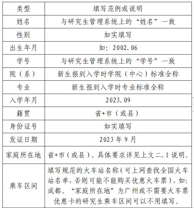1.新生登陆研究生信息管理系统,确保家庭住址和火车终点站信息准确。在研究生证“家庭所在地”栏中按照省+市(或县)的格式填入家庭所在地(如四川成都),在乘车区间“到站”栏中按格式要求填入火车站名(需按照铁道部规定的学生家庭最近城市的规范火车站名称进行填写,如:成都。站名前不要带所属省、市名称,站名后不要带县或镇名称,火车站站名后也不要加“市”、“站”或“车站”字样)。