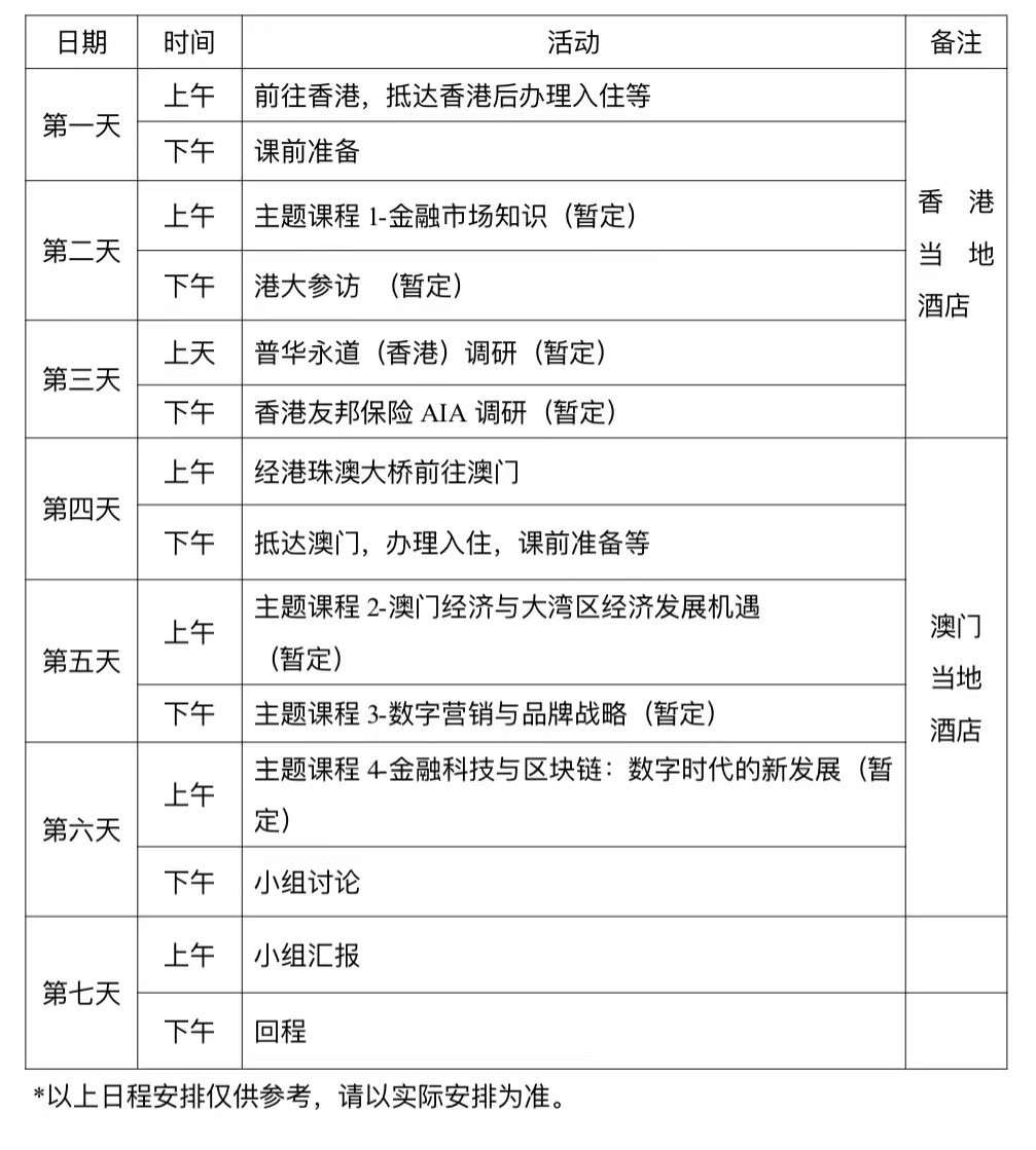 费用包括:项目管理费、学费、香港、澳门当地住宿费用、访学期间专门大巴接送及研习参访费用、出行保险。