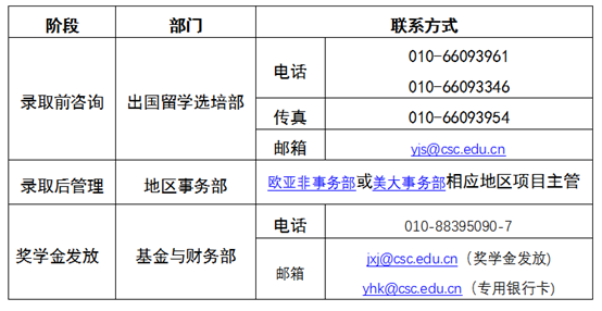 录取前的相关事宜,请与出国留学选培部联系;录取后的管理工作,请与欧亚非事务部或美大事务部联系;奖学金发放相关事宜,请与基金与财务部联系。